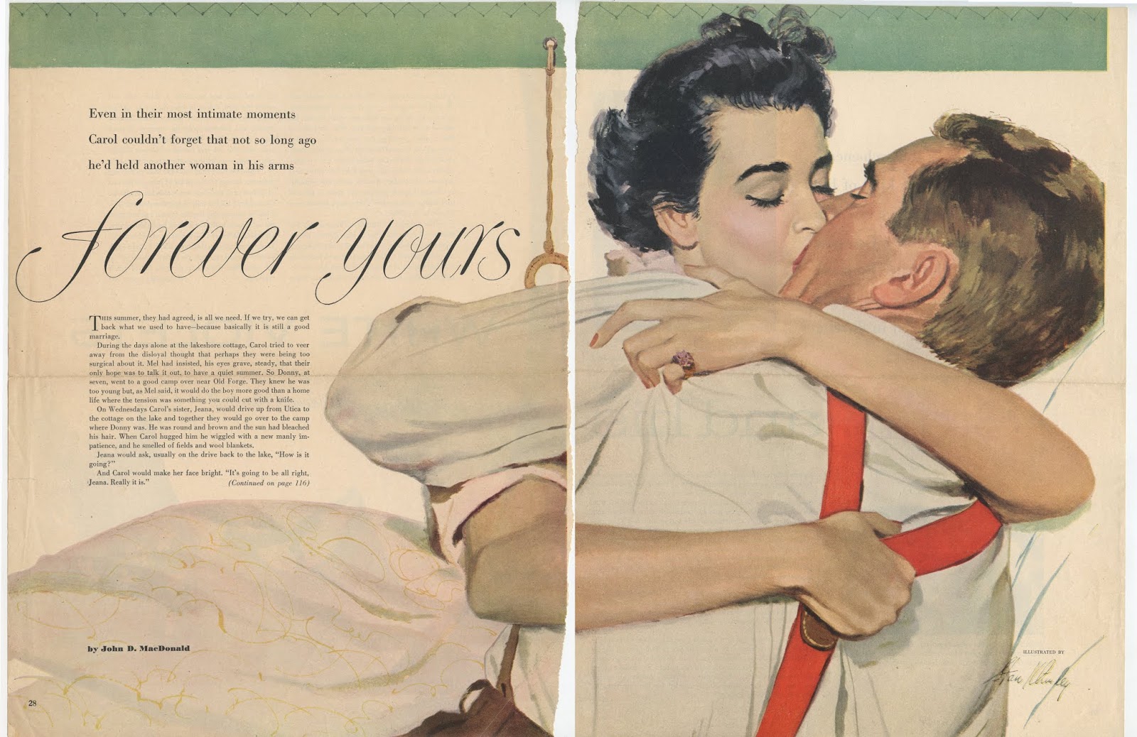 Looking at these, it came to mind that one of the areas where periodical illustration still held a candle to the sensationalism of movies was in the area of kissing limits. Whereas the Motion Picture Production Code, throughout the middle of the century, had a strict 3 second limit for onscreen smooches, the picture painter could offer a kiss that lasted; that stayed still for endless rapt contemplation. Romantically hopeful women were free to dream into these images all they wanted and for all they were worth.