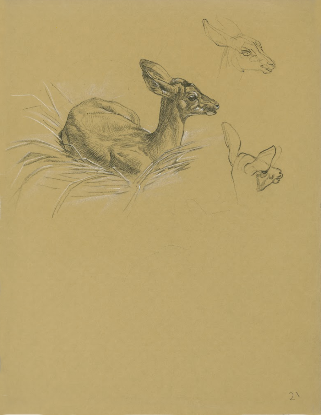 Kev Ferrara-- It's quite possible; your description of the marks seems right, although Sheppard did many studies of deer on the same type of paper that seem more clearly to be from life, reflecting different turns of the head and positions of ears.. I've spoken with Sheppard's daughter who recalls many long dull afternoons at the zoo waiting for her father to complete his drawings from life, but there were far too many drawings for her to weigh in on this particular one.