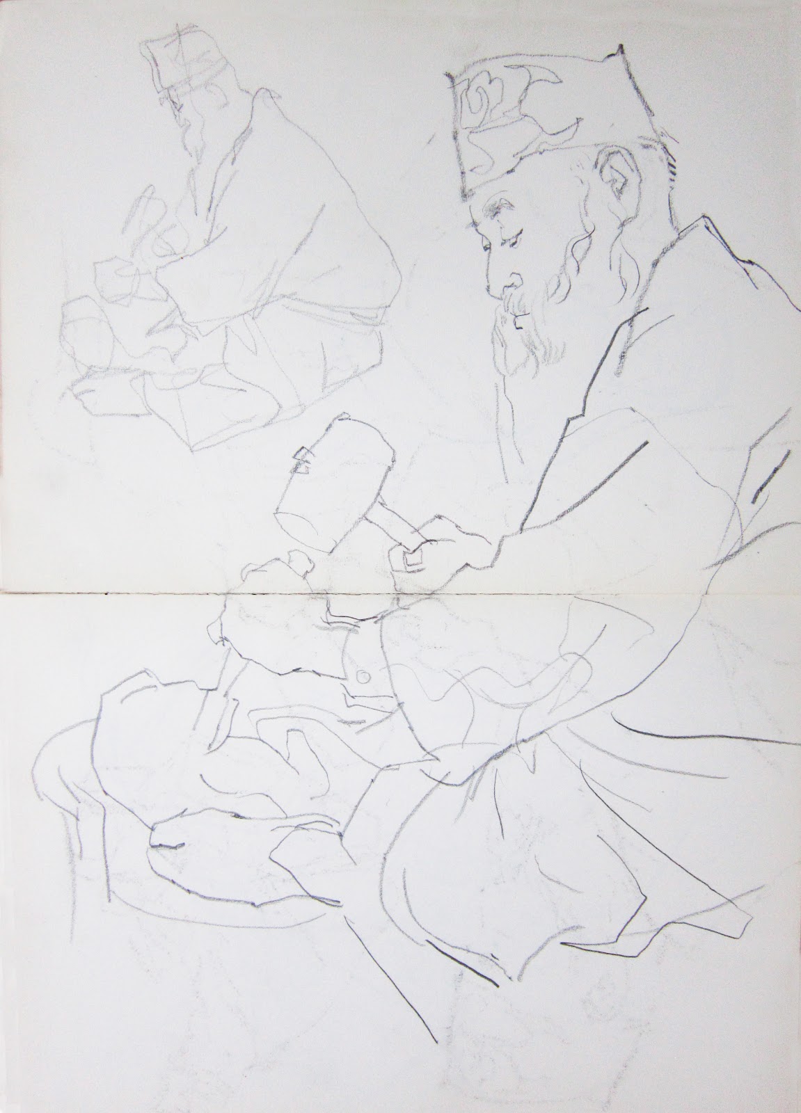 Some of the drawings are exaggerated and impressionistic, such as this sketch of a burly Russian in a big fur coat:
